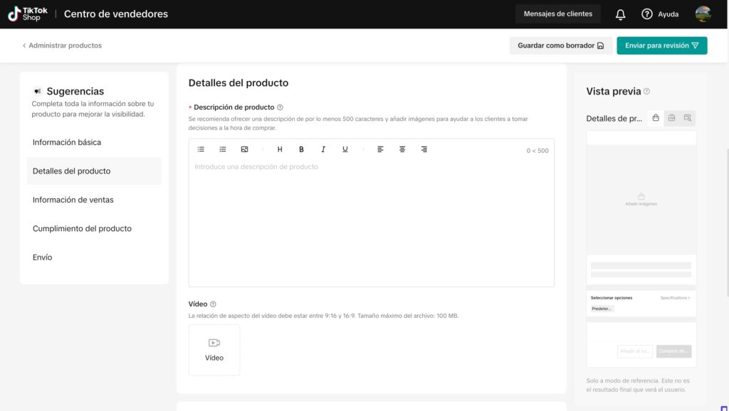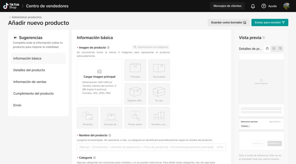 Debes tener una cuenta aprobada como vendedor en el TikTok Shop Seller Center. Para ello registra, verifica y configura tu cuenta en su página de registro - Información de producto lista: